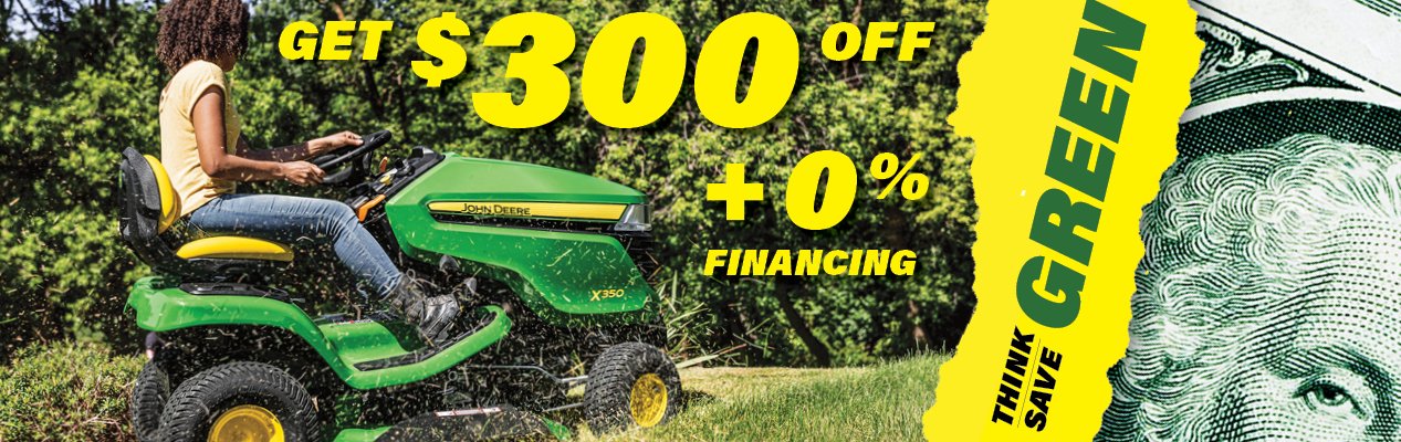 1Offer valid on qualifying purchases made 01 February 2024 through 29 February 2024. Prices and models may vary by dealer. Save $300 USD on new X350 Select Series Lawn Tractors only. This can be combined with current installment options. Sales to government agencies, company direct sales or other individuals or entities participating in any John Deere Special Discount Program or Rental Business Program are not eligible. Some restrictions apply. See participating dealer for details and other financing options. Offer is available only at participating United States dealers. Prices and savings are in U.S. dollars.